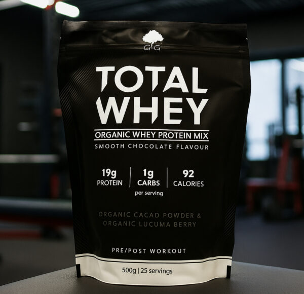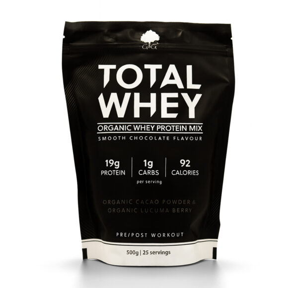 Our Total Whey is an organic whey powder that is made from 100% natural ingredients, giving you the best quality. Total Whey combines only three ingredients; organic whey, organic lucuma and organic cacao. The lucuma and cacao are added to provide a smooth chocolate flavour. This means that there’s nothing unnecessary added to our Total Whey powder.
