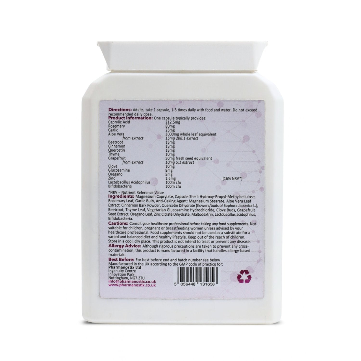Ingredients: Magnesium Caprylate (Palm Oil), Capsule Shell: Hydroxy-Propyl-Methylcellulose, Rosemary Leaf, Garlic Bulb, Anti-Caking Agent: Magnesium Stearate, Aloe Vera Leaf Extract, Cinnamon Bark Powder, Quercetin Dihydrate (flowers/buds of Sophora Japonica L.), Beetroot, Thyme Leaf, Vegetarian Glucosamine Hydrochloride, Clove Buds, Grapefruit Seed Extract, Oregano Leaf, Zinc Citrate Dihydrate, Maltodextrin, Lactobacillus acidophilus, Bifidobacteria.