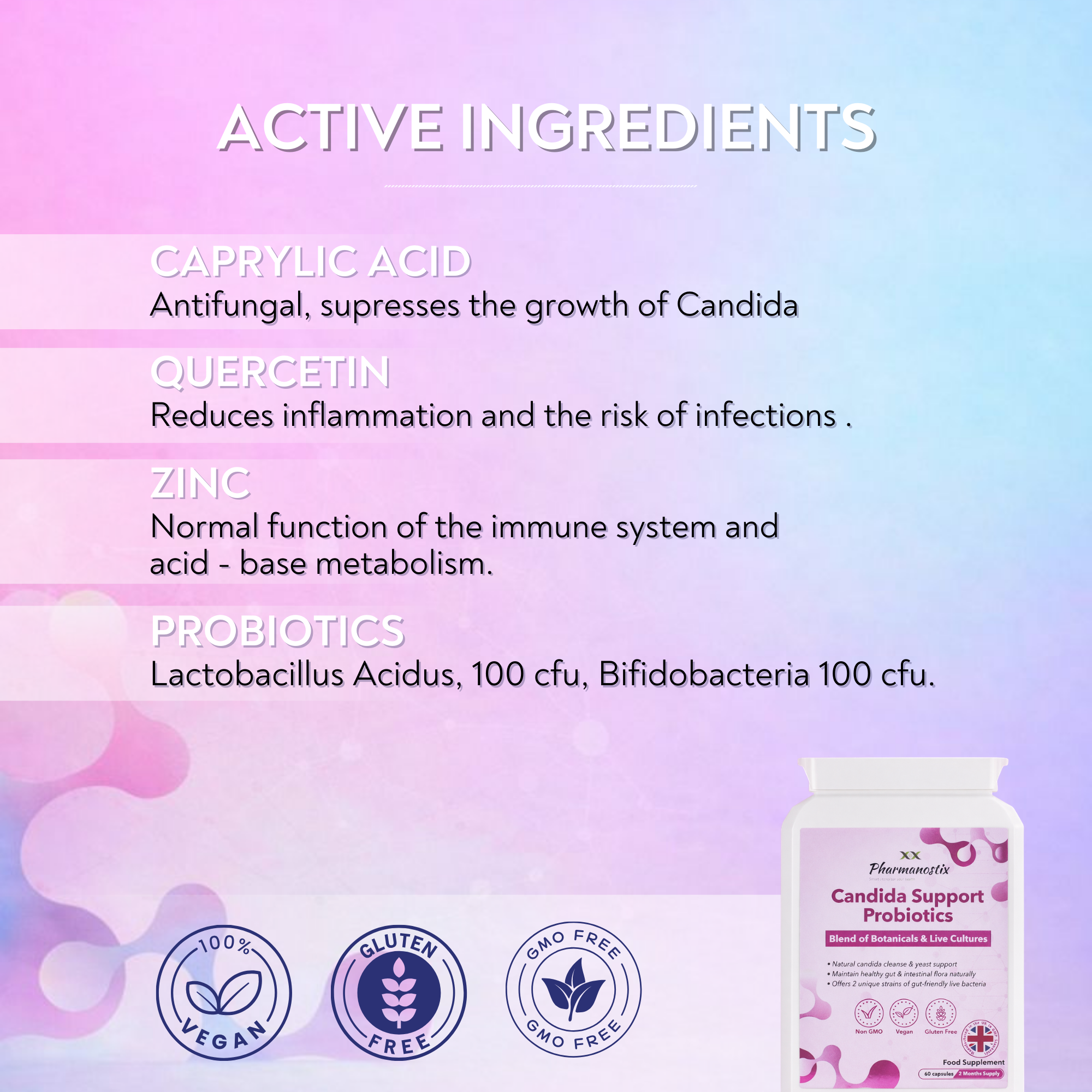 These ingredients can support your body's fight against Thrush. Candida can change from its standard yeast form to the hyphal form, which is much more capable of causing infections. caprylic acid works by interfering with the cell walls of the Candida yeast